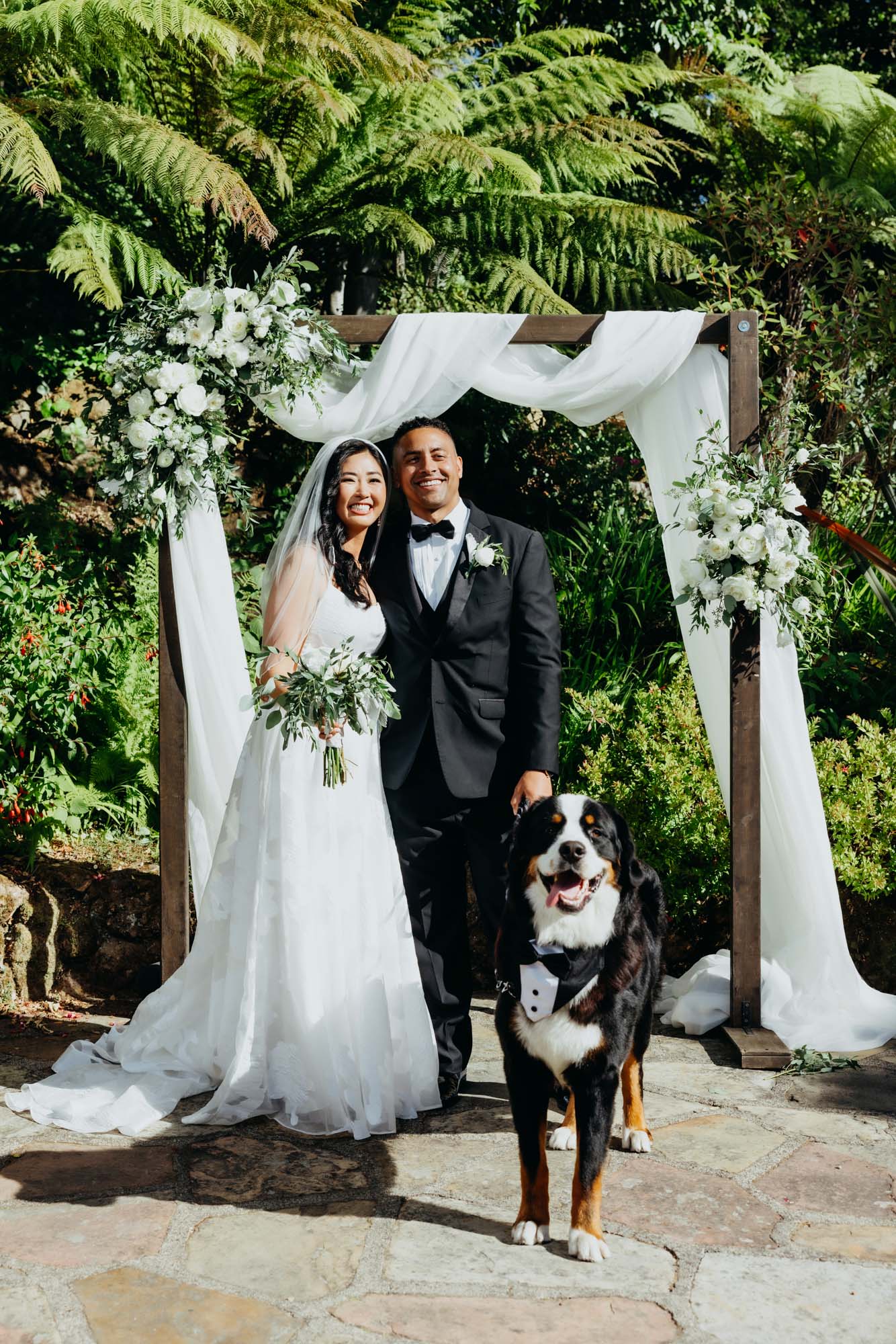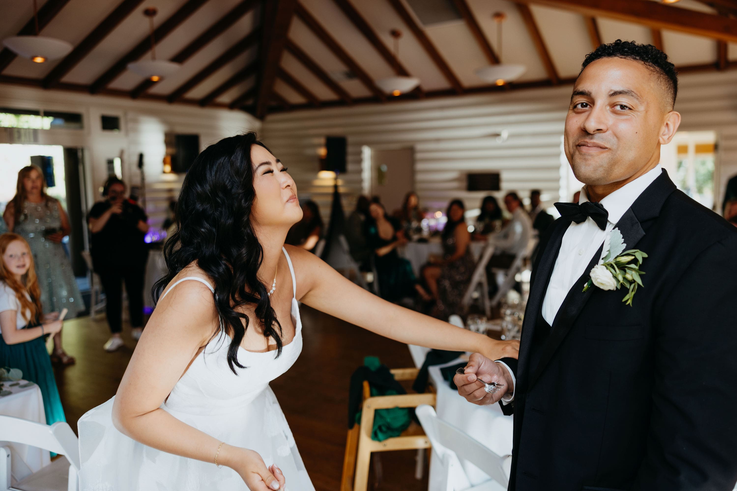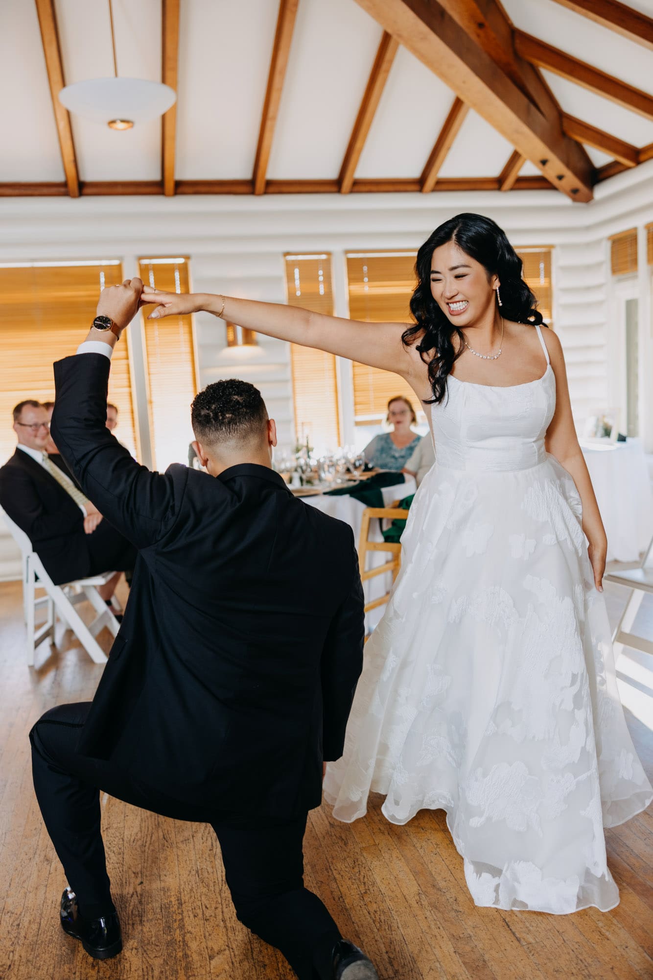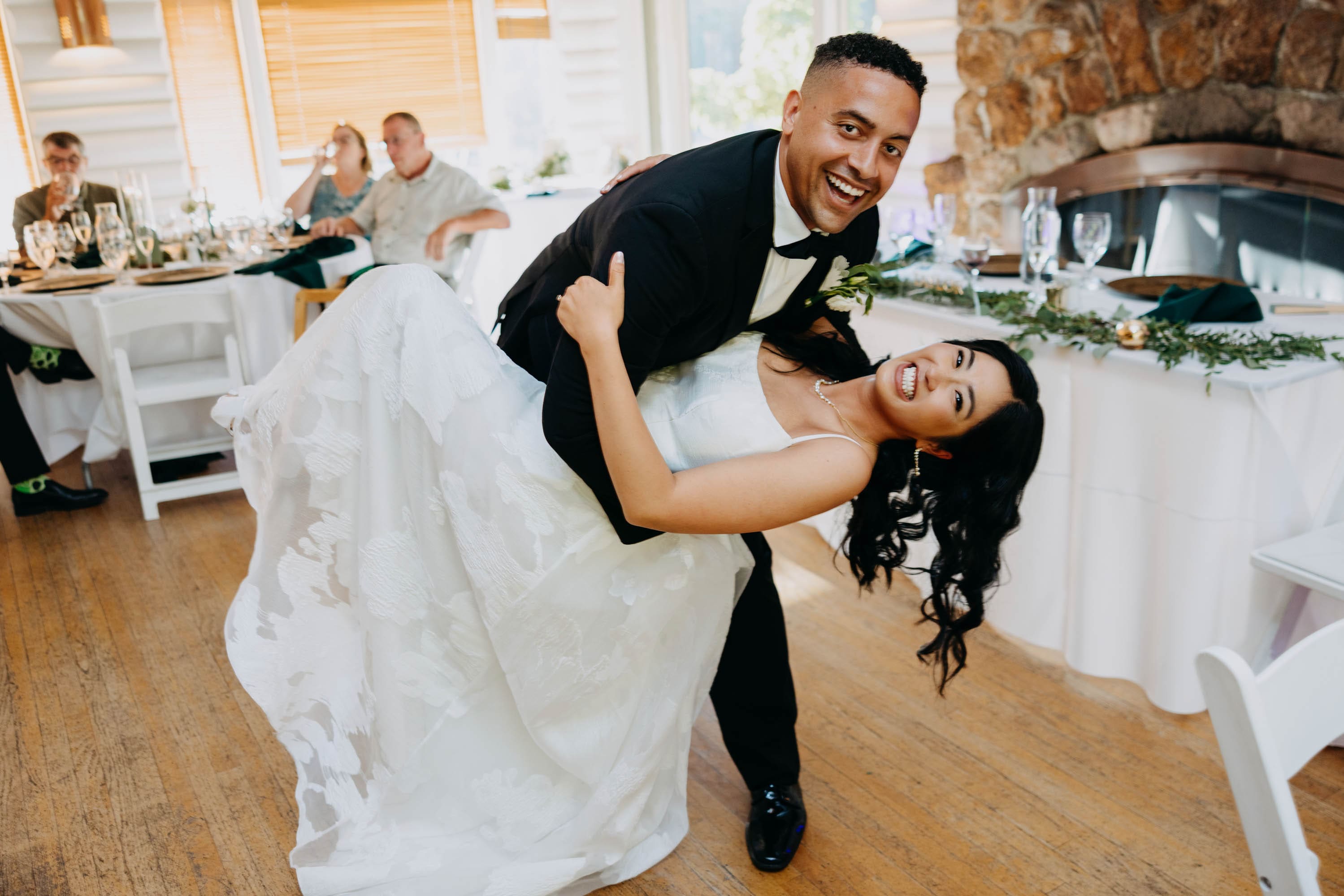They started with a first look tucked into nature — Seonah waiting, Marco walking up — followed by candid moments with their pup, Coby, sweet portraits with Grandma Iverson, and special time set aside for Seonah’s mom and the kids. It all unfolded against a backdrop of eucalyptus greens, cozy woodsy vibes, and that laid-back energy they carried through the whole day. And yes, they nailed their first dance — complete with a swoon-worthy dip at the end we definitely captured.
