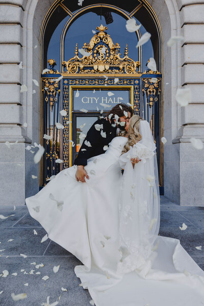 Getting married at San Francisco City Hall isn’t just about the “I do” — it’s about creating a vibe that feels unapologetically you. Couples are flying in from all over to make this moment happen, and we’re here to co-create something that looks and feels like your love story. That might mean tossing flowers on you as you strut out of City Hall, collaborating on that sweet Pinterest board you’ve been curating for months, or arranging a heart‑shaped cake for you two to dive into. We’re all about those small but mighty details — the ones that take your day from beautiful to unforgettable. Because when it comes to celebrating your BIG day, we believe your wedding should look like you… but elevated.